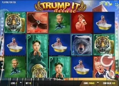 لعبة فيديو سلوتس Trump It التقدمية (جاكبوت) هي من إنتاج شركة برمجيات فوغاسو Fugaso أيضًا والتي تتوفر في الكثير من الكازينوهات على الإنترنت. لعبة سلوتس Trump It هي من العاب السلوتس التقدمية التي تقدم جوائز ضخمة للاعبين تصل إلى مليون دولار. تحتوي اللعبة على 5 بكرات وعدد 15 خط دفع. السمة التي تغلب على هذه اللعبة هي سياسية، حيث تضم عدد من رؤساء الدول المختلفة وعلى رأسهم الرئيس الأمريكي دونالد ترامب. من حيث المؤثرات البصرية، فإن اللعبة رائعة وتحتوي على رسومات جميلة وتفاصيل دقيقة لوجه كل شخصية سياسية تمثل رمز من رموز اللعبة. بعض الرسومات المتحركة والكاريكاتورية في اللعبة توحي بالضحك. ستكون على موعد مع عدد من قادة دول العالم من خلال لعبة سلوتس دونالد ترامب التقدمية هذه.